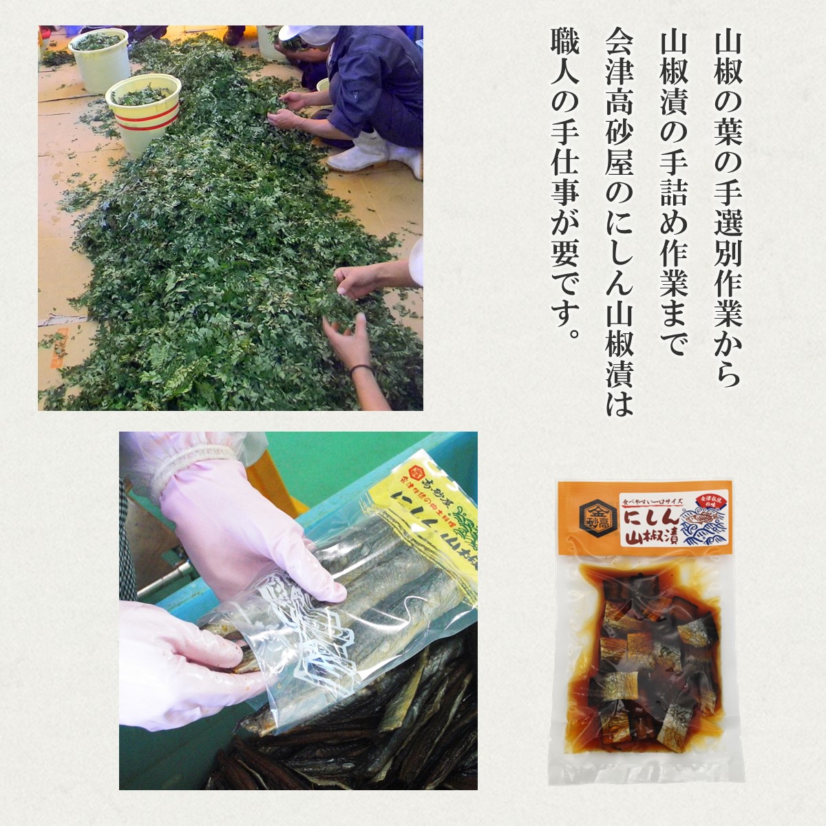 じっくりと乾燥させ旨みの凝縮した身欠きにしんを、キンタカサゴ醤油と本みりん、醸造酢をベースにした秘伝の漬けダレに、山椒と一緒に漬け込みました。